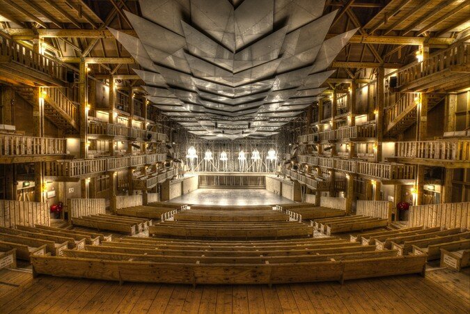The Grange au Lac is an exceptional venue, that marries the finesse of Murano glass chandeliers with the frugality of wooden seating and its untreated finish. It does not look like much from the outside. Spectators arrive on foot or via the funicular railway and spot this huge barn built from red cedar and Jura pine among the larch trees.